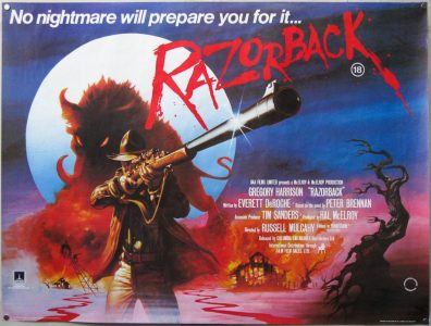 I seem to have a swine theme this week. Writing about Clive Barker’s excellent short story, “Pig Blood Blues,” put me in mind of the best, and, possibly, the first, wild boar run amok movie ever made. Released way back in the halcyon days of 1984, Razorback furthers the scientific theory that every animal, reptile, and insect in Australia wants to kill you. It also proves that kangaroos make some freaky, creepy sounds (they are downright chilling).